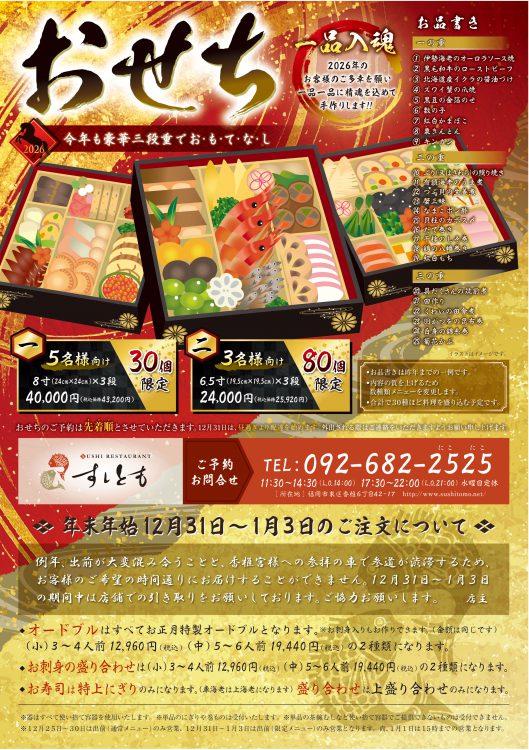 2026年のお客様のご多幸を願い、一品一品に精魂を込めて手作り致します!! ◆ご予約は、5名様向け30個限定、3名様向け80個限定とさせて頂きます。
